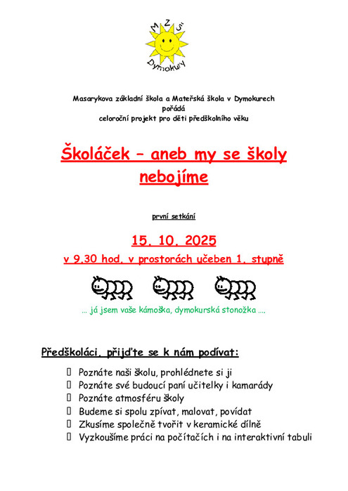 Ve středu 15. října se předškolní děti zapojí do projektu Školáček. Tento projekt je zaměřen na usnadnění vstupu budoucím žákům 1. třídy do školy, na seznámení předškolních dětí s prostředím školy (učebny, tělocvična, počítačová učebna, keramická dílna apod.), s budoucími učiteli a také poznat se navzájem.