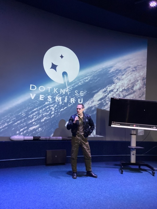 Cestou zpět do sálu jsme zjistili, že Planetárium navštívil pan Aleš Svoboda, český stíhací pilot, která byl nedávno vybrán do týmu astronautů ESA (Evropská kosmická agentura). Přišel nás pozdravit, prohlédl si naše prezentace a popřál nám mnoho úspěchů. Bylo to neplánované, ale milé setkání.