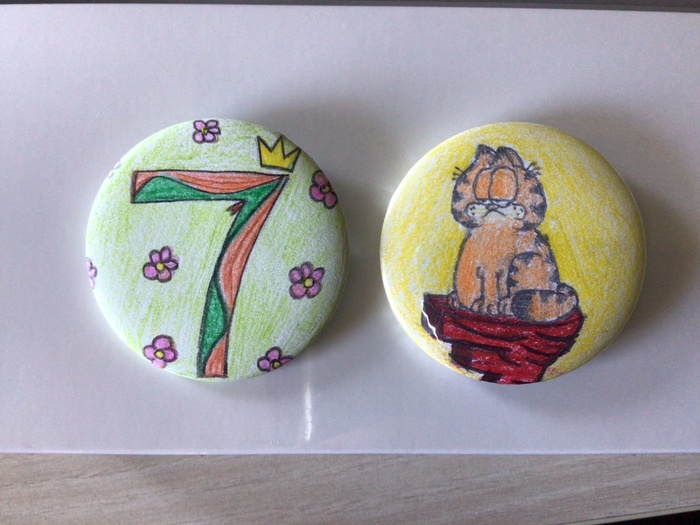 ři hodině výtvarné výchovy si všichni vyrobili svojí “placku” se stejným motivem. Protože jsme už sedmáci, byla to prostě “ sedmička”. Návrhů bylo sice více, ale na tomhle se nás shodlo nejvíce. Placky se opravdu povedly. Posuďte sami.