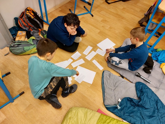 Ještě než jsme se rozprchli na pololetní prázdniny, rozhodli jsme se, že si školu užijeme, ale tentokrát trochu jinak. Rychle domů, odevzdat vysvědčení a hurá zpátky do školy. Čekala na nás stezka odvahy, pizza, luštění, tělocvična, film, hraní her a to vše pod rouškou tmy. Ale my máme pro strach uděláno! A kdo potřebuje, toho přibereme do týmu a pomůžeme mu. Přežili jsme! Mnozí jsme toho moc nenaspali, ale čekají nás přeci prázdniny!